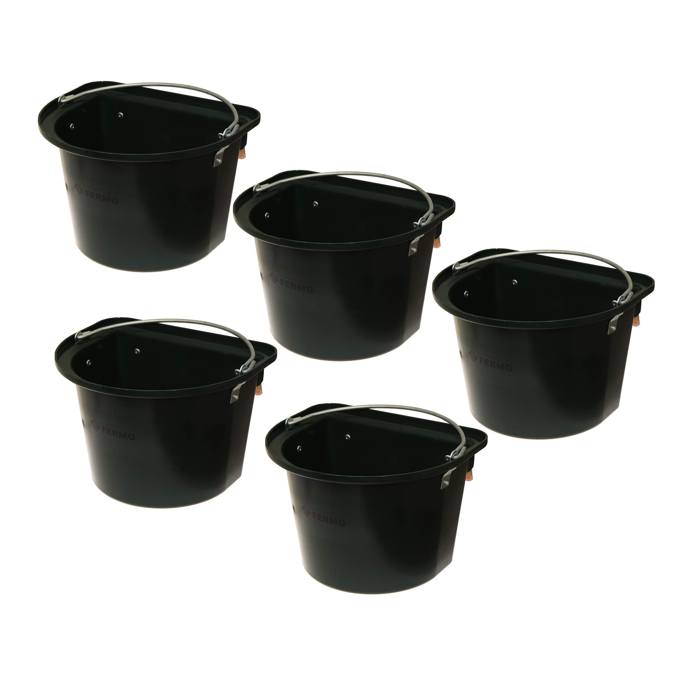Zestaw 5 koryt wiadrowych dla koni i bydła. Każde z wiader posiada pojemność ok. 12l i wyposażone jest w praktyczne uchwyty do zawieszenia na ścianie boksu czy ogrodzeniu oraz pałąk do przenoszenia . Żłóby wiadrowe tego typu idealnie nadają się podawania koniom i bydłu wody czy paszy. Wiadra wykonano z bardzo mocnego tworzywa sztucznego, a uchwyty i pałąk ze stali ocynkowanej.