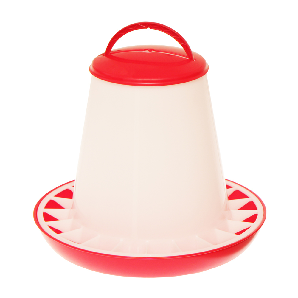 Karmidło z zasobnikiem o pojemności 6 kg. Paśnik doskonale sprawdza się do hodowli kur, kaczek, indyków, bażantów, przepiórek oraz innych ptaków. Karmnik wyposażony został w kratkę, która uniemożliwia ptakom rozsypywanie paszy. Dodatkowo żeberka sprawiają, że ptaki nie wchodzą do wnętrza karmidła. Karmidło jest proste w użytkowaniu. Hodowca uzupełnia jedynie zasobnik przez specjalny otwór, a pasza sama napływa do misy w miarę zjadania jej przez ptaki. Dzięki wygodnej rączce karmidło można szybko przetransportować w dowolne miejsce. Konstrukcja została opracowana w sposób pozwalający również na łatwe czyszczenie karmidła. Całość wykonana została z wysokiej jakości tworzywa sztucznego. Karmidło jest wytrzymałe i odporne na trudne warunki atmosferyczne. Czerwony kolor misy sprawia, że ptaki chętnie pobierają paszę z karmidła.