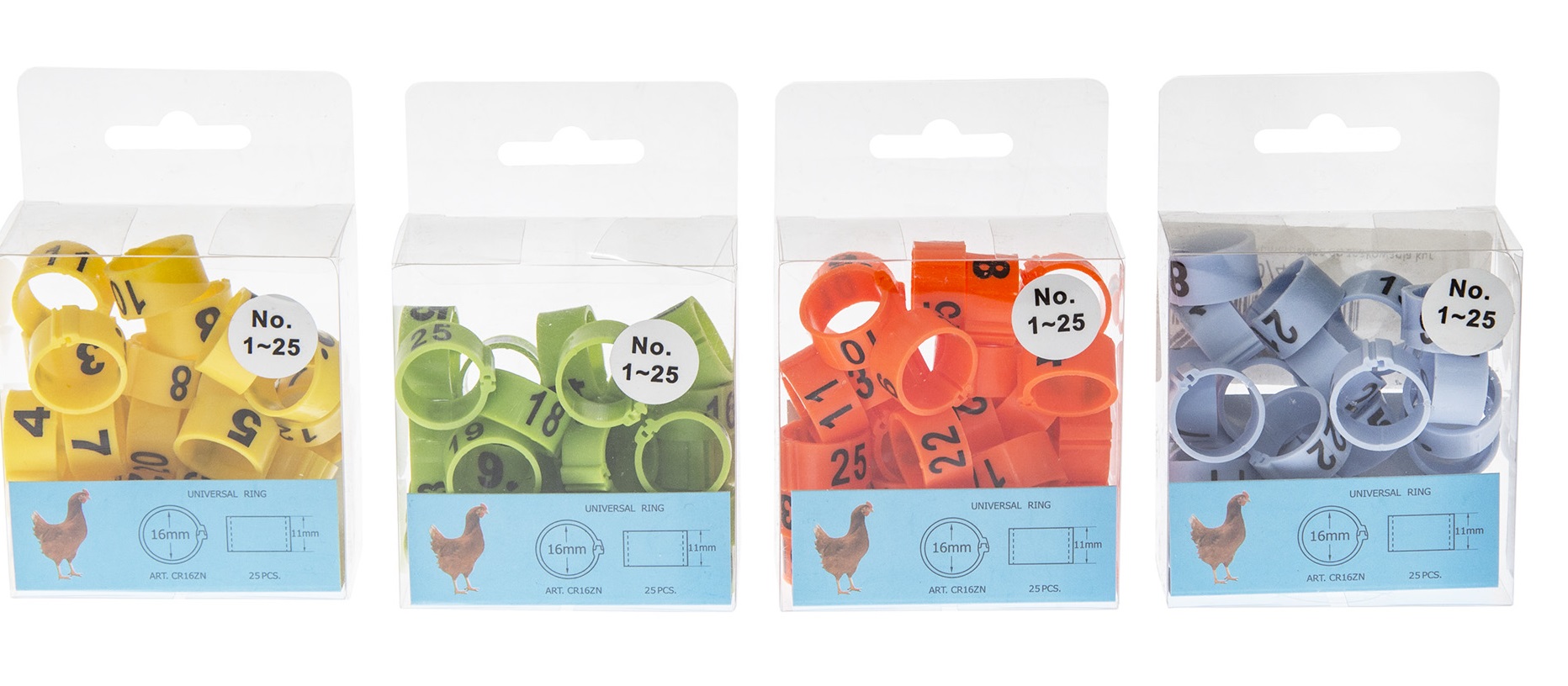 Obrączki do znakowania drobiu o średnicy 16 mm. Doskonale sprawdzają dla kur niosek oraz brojlerów. Zastosowanie znaczników pozwala w łatwy sposób rozróżnić ptaki np. ze względu na pochodzenie, przyjmowane lekarstwa czy wiek. Znaczniki posiadają numerację od 1-25. W łatwy sposób zakłada się je na nodze ptaka poprzez zatrzaśnięcie. Obrączki są lekkie, dzięki czemu nie przeszkadzają kurom.Obrączki dla drobiu wykonane zostały z tworzywa sztucznego. Można je wielokrotnie używać. Dostępne w 15 różnych kolorach. Oferta dotyczy 25 sztuk obrączek w jednym kolorze.