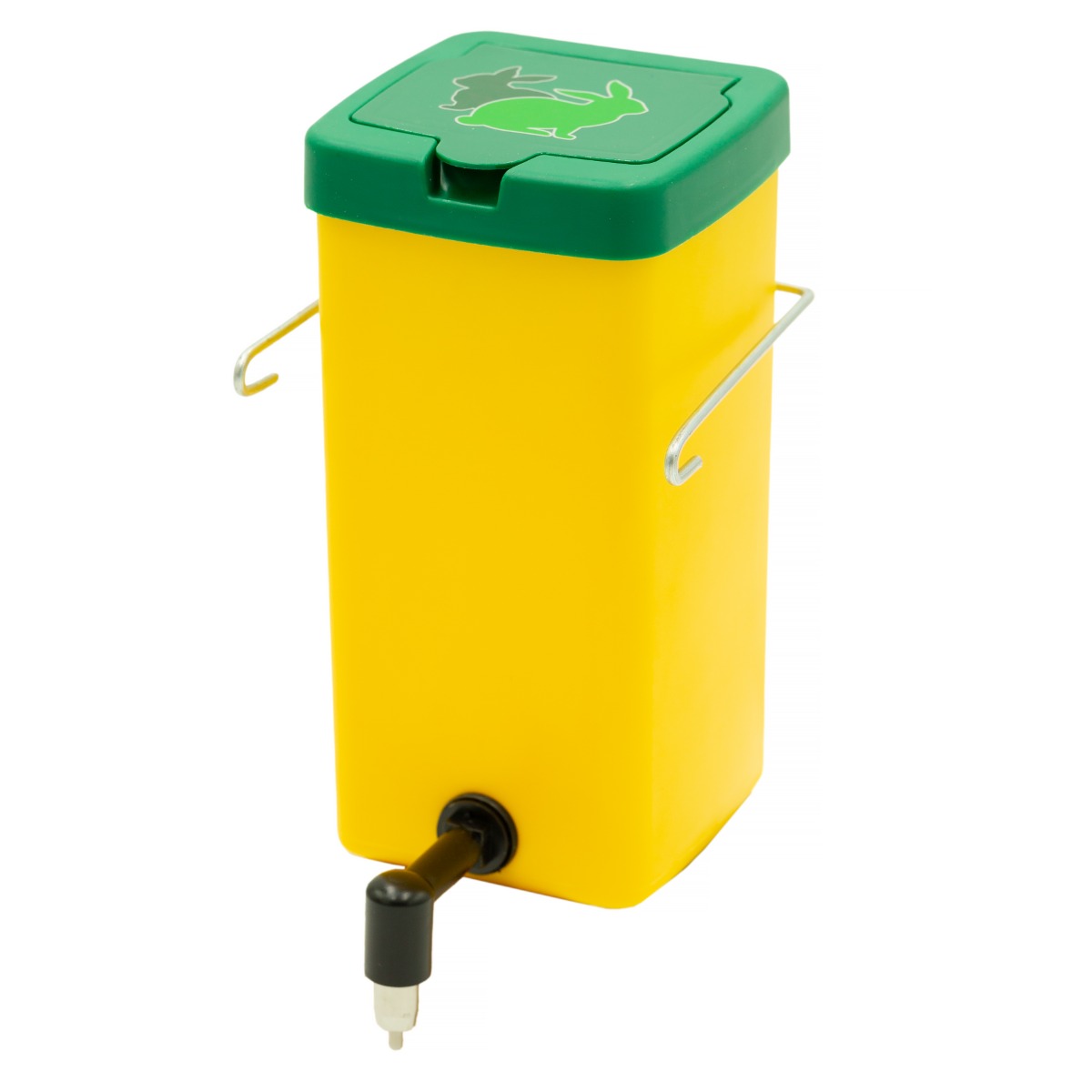 Poidło dla królików z zasobnikiem 1l. Poidełko posiada smoczek skierowany pod kątem prostym, dzięki czemu króliki oraz inne zwierzęta futerkowe łatwo pobierają wodę. Żółte poidło dla królików ze względu na swą konstrukcję jest chętnie wybierane przez hodowców, którzy doceniają łatwe dolewanie wody (poprzez otwieraną pokrywę), a także bezproblemowy demontaż celem czyszczenia. Poidło bardzo łatwo montuje się kracie dzięki drucianemu uchwytowi. Jego zastosowanie w klatce pozwala zachować czystość, ponieważ zwierzęta nie rozlewają wody. Poidełko dla królików wykonane zostało z najwyższej jakości materiałów. Jest odporne na trudne warunki atmosferyczne, dlatego może być używane zarówno wewnątrz, jak i na zewnątrz pomieszczeń. W zasobniku podawać można witaminy i zakwaszacze dla królików.