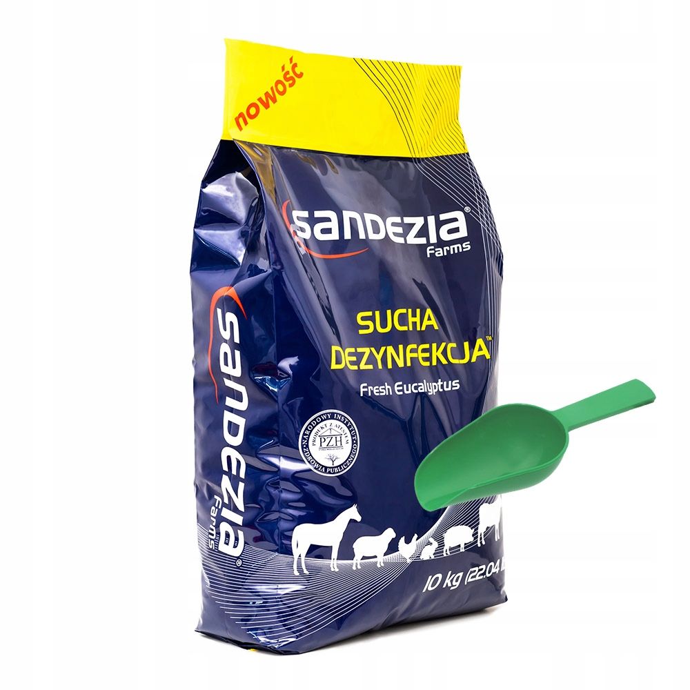 Środek Sandezia do suchej dezynfekcji w opakowaniu 10 kg. Zastosowanie preparatu dezynfekującego ma na celu zwalczenie groźnych bakterii, wirusów i grzybów w hodowli zwierząt. Sandezia jest uniwersalna i może być stosowana we wszystkich obiektach inwentarskich: kurnikach, chlewniach, oborach, stajniach, króliczarniach, gołębnikach. Preparatem tym można dezynfekować środki transportu zwierząt, maszyny do produkcji paszy, a także wykonywać tzw. "suchą kąpiel prosiąt" w pierwszych dniach ich życia. Środek sprawdza się do wszystkich rodzajów powierzchni: podłóg, ściółek, rusztów i posadzek. Do najważniejszych zalet stosowania środka Sandezia należą: