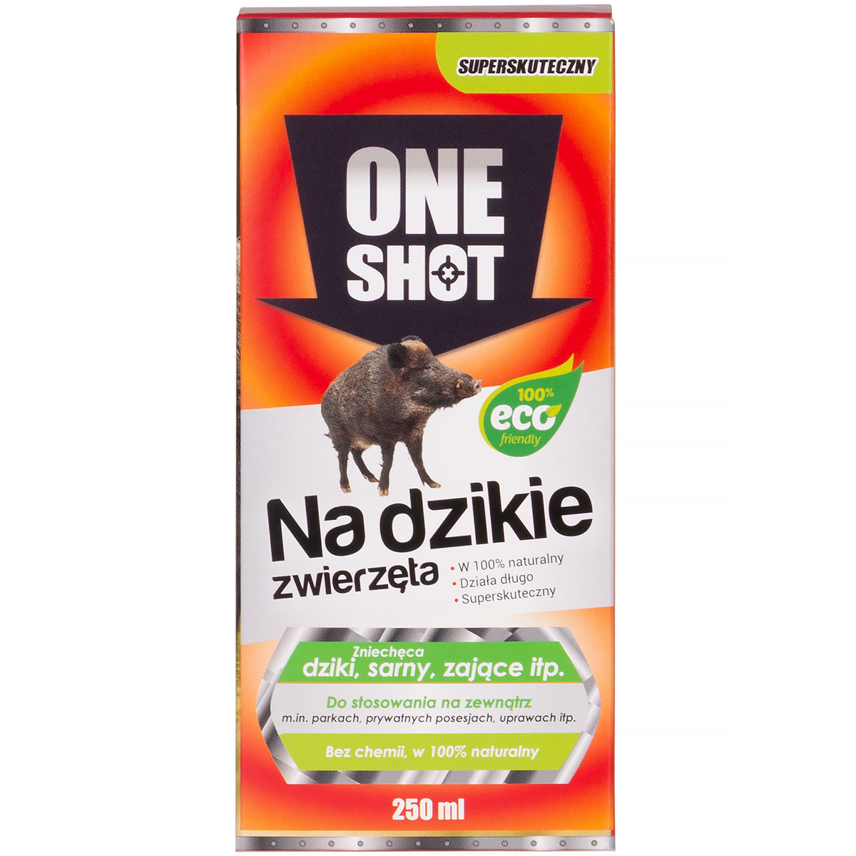 Skuteczny odstraszacz dzikiej zwierzyny w postaci koncentratu 250 ml. Doskonale sprawdza się do zniechęcania dzików, saren, jeleni, łosi, zajęcy, kun oraz innych zwierząt. Odstraszacz naturalny one shot służy do ochrony pól uprawnych, sadów, stawów oraz innych miejsc, które narażone są na szkody wyrządzane przez dziką zwierzyną. Stosuje się go również w obejściach domostw do których podchodzą dziki, czy zabezpieczenia domów przed kunami. Zniechęcacz dzikiej zwierzyny opracowany został na bazie naturalnych składników, dzięki czemu nie jest szkodliwy dla ludzi i środowiska. Intensywna kompozycja zapachowa sprawia, że dziki unikają spryskanych czy oznaczonych koncentratem miejsc. Preparat odstraszający zwierzęta jest bardzo łatwy w użyciu i można go stosować w dwojaki sposób: